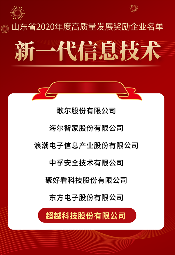 近日,按照山東《省級支持高質量發展獎勵資金實施細則》規定,省相關“十強”產業專班評選了2020年度高質量發展獎勵企業名單。在”十強產業“之首的”新一代信息技術“高質量發展獎勵評選中,超越科技股份有限公司成功登榜。
