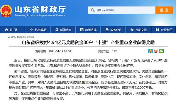 山東省委、省政府確定設立支持高質量發展獎勵資金,對重點企業實行增量稅收獎勵政策,獎勵范圍包括新一代信息技術、高端裝備、新能源、新材料、現代海洋、醫養健康、高端化工、現代高效農業、文化創意、精品旅游等重點產業。獎勵對象為每個重點產業中經濟社會效益突出、稅收貢獻大的龍頭企業。登榜企業除獲得省級獎勵外,還將在未來發展中獲得相關傾斜支持。